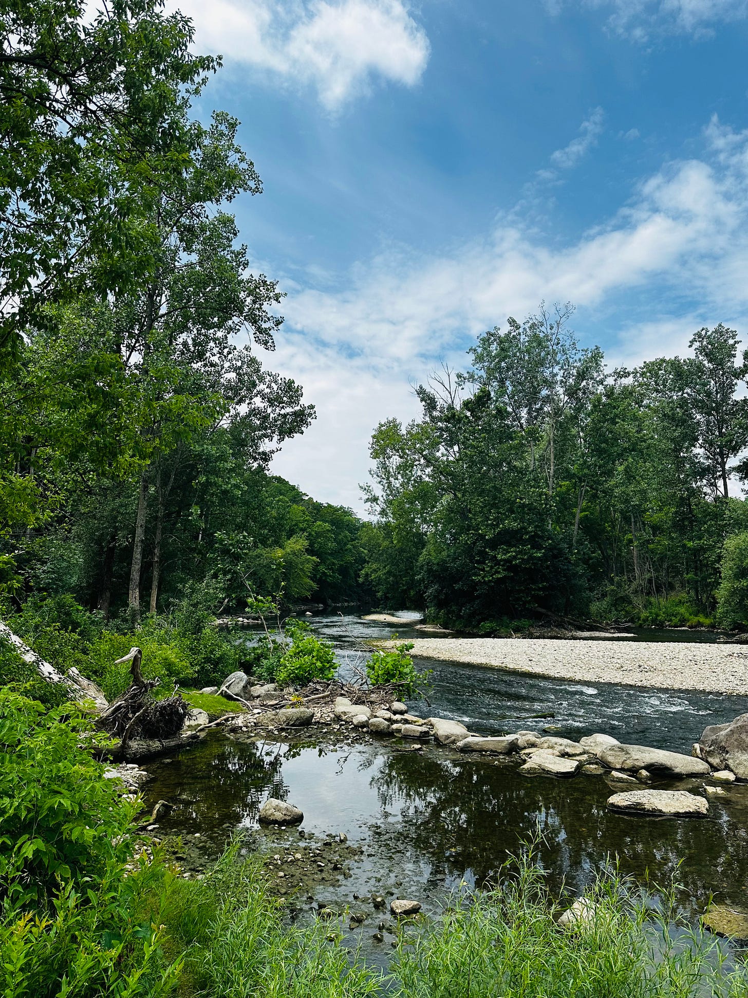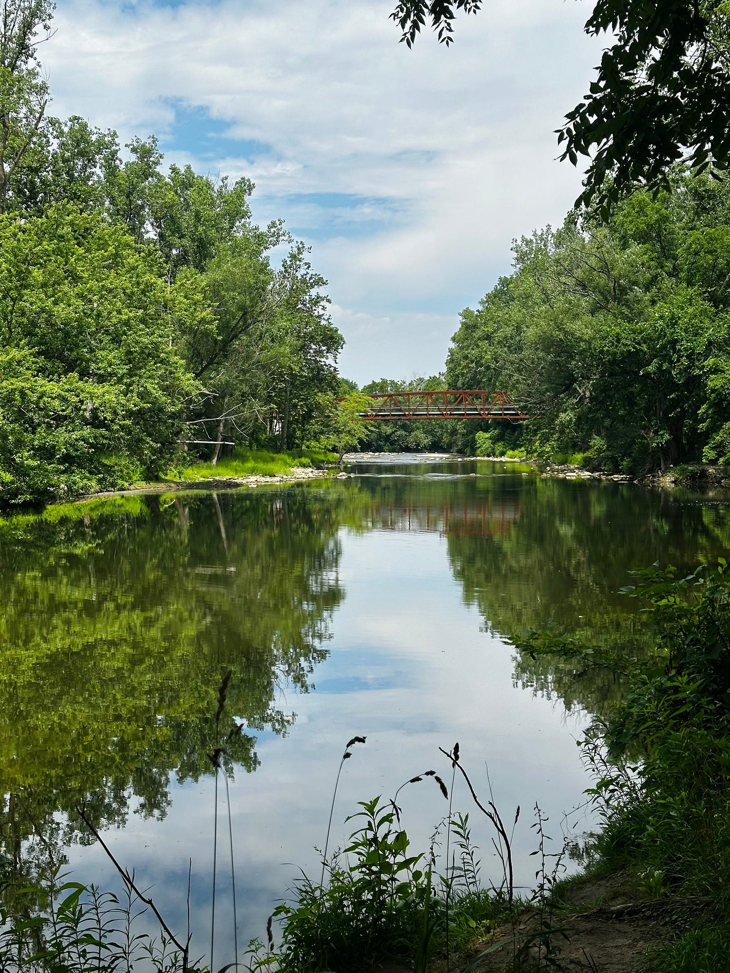It took me to the river. Wide. Gorgeous. Little rapids breaking the perfect water mirror here and there. A red rusty bridge connecting the crowns of the trees in the distance. Symmetrical green. Complementary perfect.